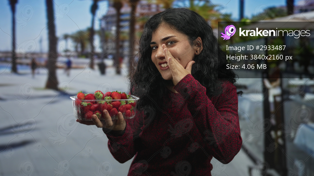 Young brunette woman holding a plastic container of strawberries with hand on cheek for toothache on street near restaurant terrace outdoors; playful curiosity. - Kraken Images