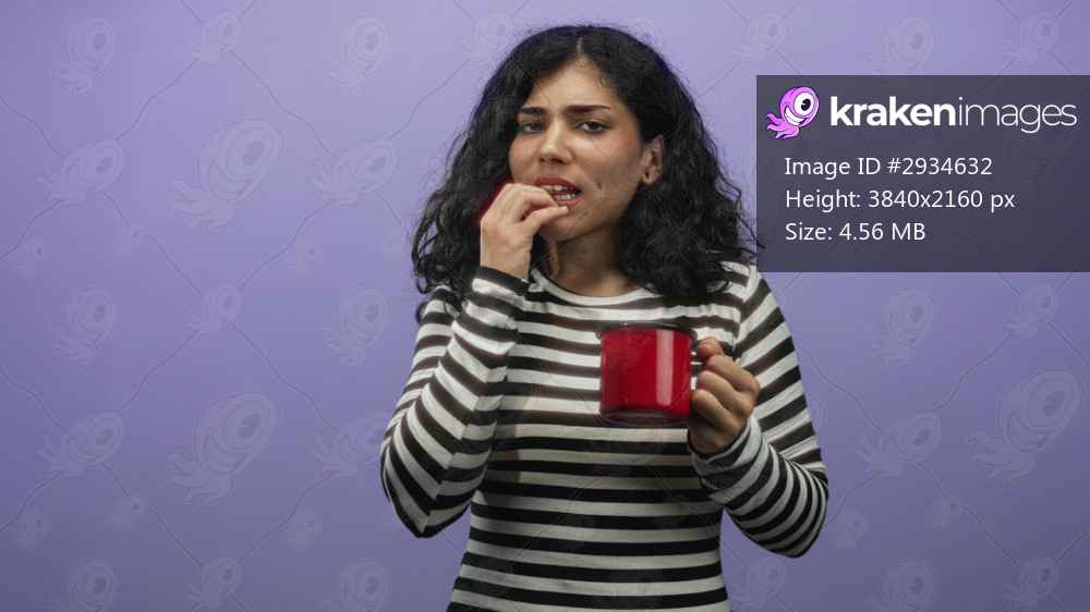 Young brunette woman holding a red mug with hand on chest in studio with purple backdrop wearing striped top; discomfort doubt introspection.