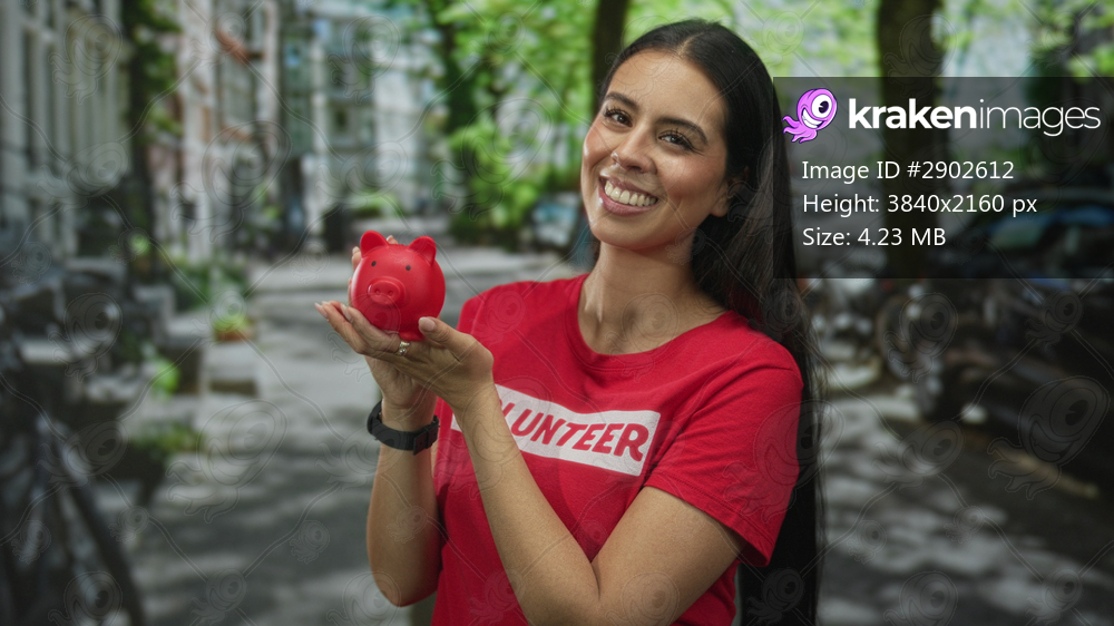 Young brunette woman holding a red piggy bank with both hands on a street, smiling and presenting it to camera; community giving hope.
