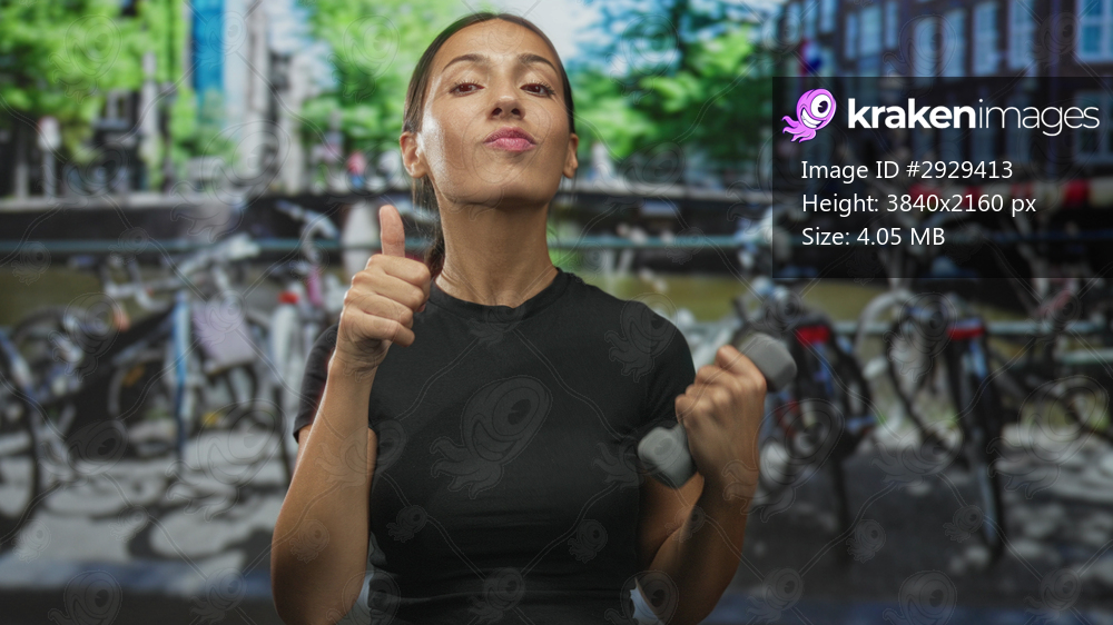 Young brunette woman holding a small dumbbell in one hand and giving thumbs up with the other on amsterdam street; confidence.