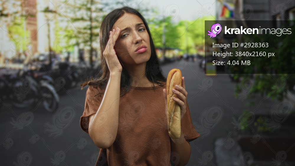Young brunette woman holding baguette with hand to cheek while wincing on city street; hunger discomfort.
