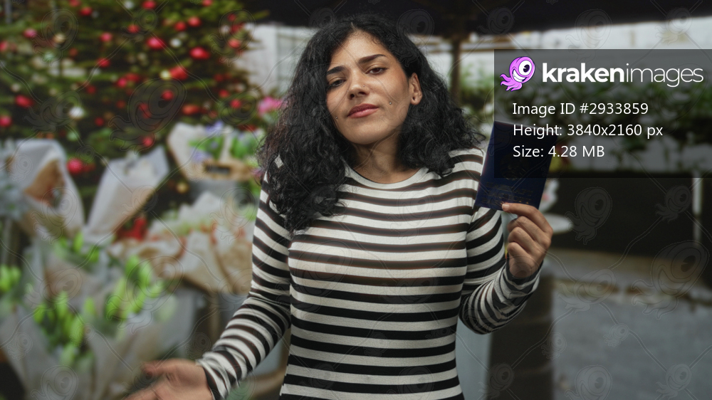Young brunette woman holding belarus passport and open hand gesture on street market near flower stalls and bouquets; migration hope.