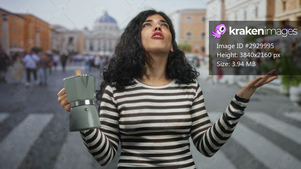 Young brunette woman holding coffee pot and gesturing on a cobbled street near the vatican building; confusion travel coffee.
