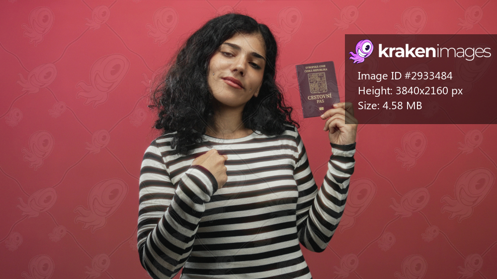 Young brunette woman holding czech passport and hand to chest in red studio; confidence travel aspiration.