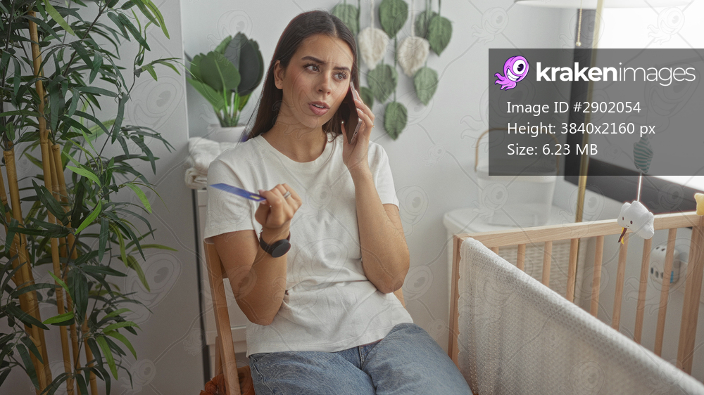 Young brunette woman holding phone to ear and inspecting a card by a wooden baby cradle in a bedroom; financial worry.
