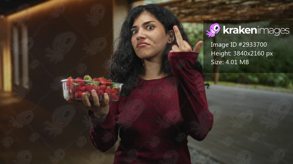 Young brunette woman holding plastic container of fresh strawberries shows middle finger in studio hallway; defiance.