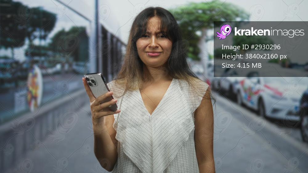Young brunette woman holding smartphone on city street, frowning at screen while standing near parked cars and trees; digital frustration.