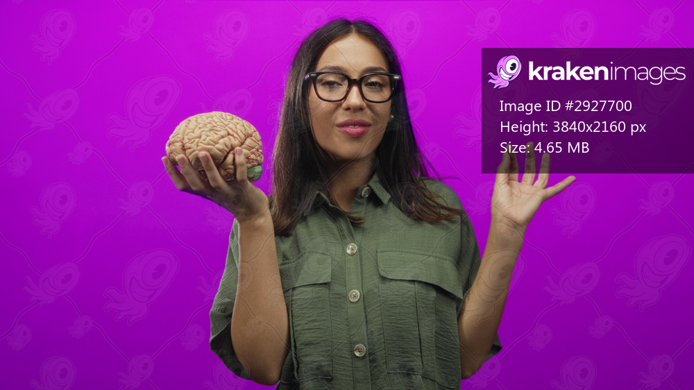 Young brunette woman holds brain model in hand with closed eyes and meditative mudra in magenta studio; mindfulness focus.
