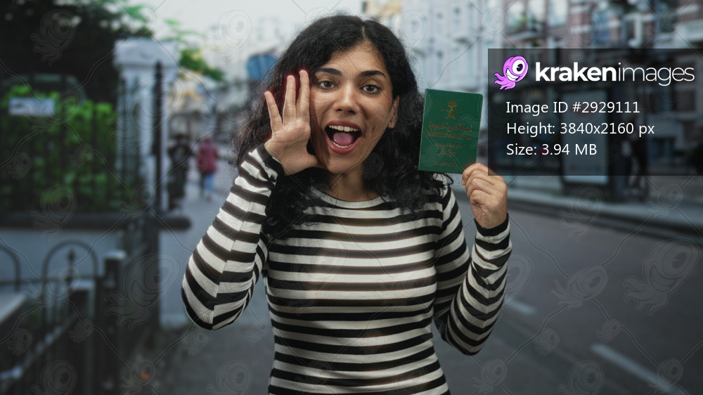 Young brunette woman holds green passport in right hand and smiles while calling out on city street; travel freedom pride.