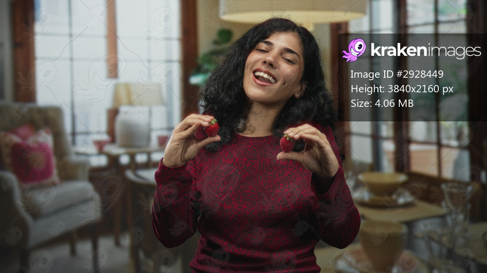 Young brunette woman in a red sweater holding two strawberries and laughing with eyes closed while tilting her head in a studio; joy.