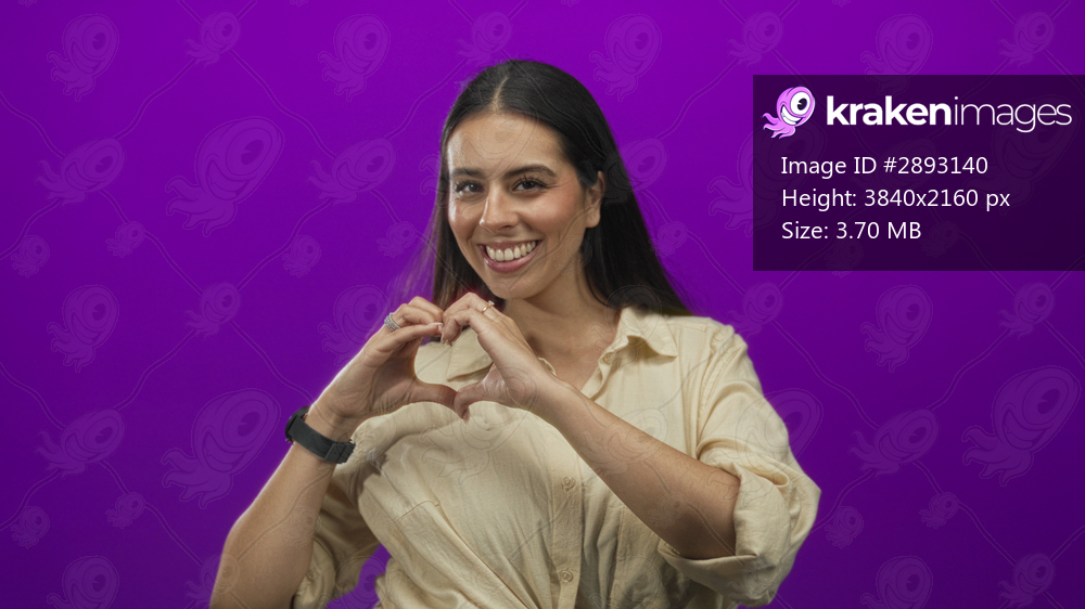 Young brunette woman in beige shirt makes heart with hands facing camera in studio purple; love joy.