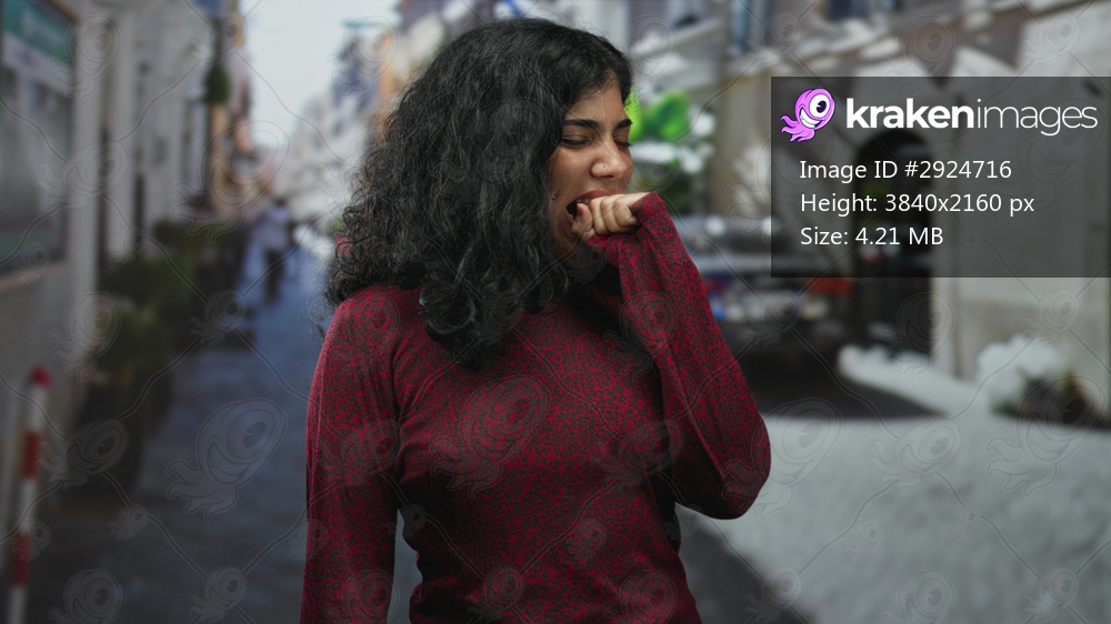Young brunette woman in red sweater bites her fist on a narrow city street, hand partly in mouth while suppressing a yawn and closing eyes; tired solitude. - Kraken Images