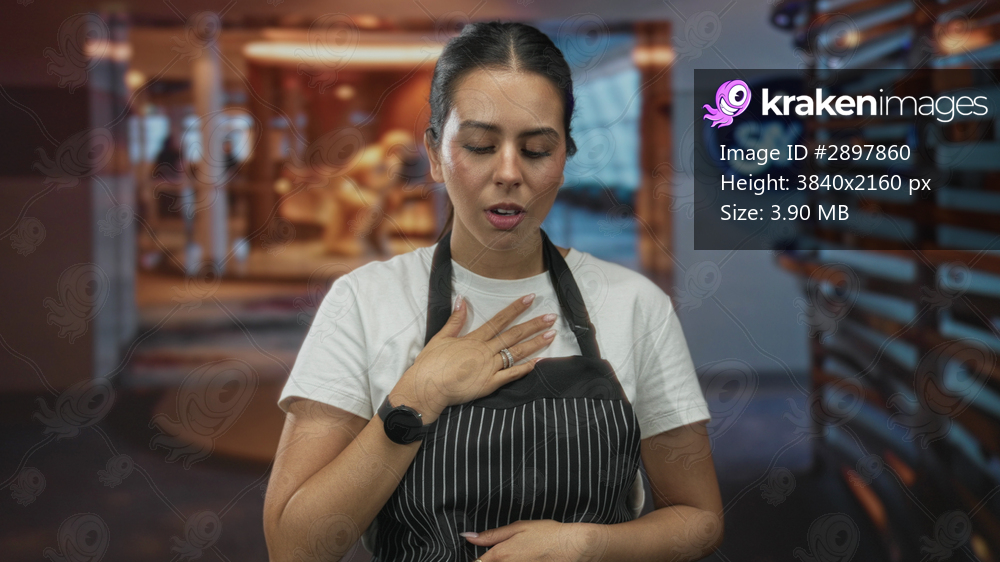 Young brunette woman in striped apron brings hand to mouth over a tasting sample while standing by a hotel building lobby display; quiet relief.