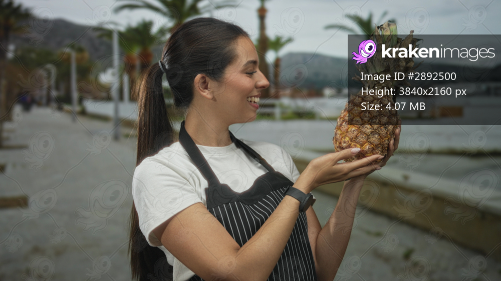 Young brunette woman in striped apron holds a pineapple with both hands on a seaside street with palm trees; freshness joy tropical.