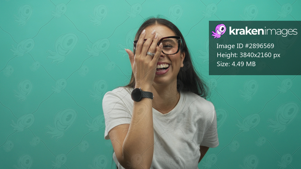 Young brunette woman laughing and covering face with hand in studio teal backdrop; joy casual candid.