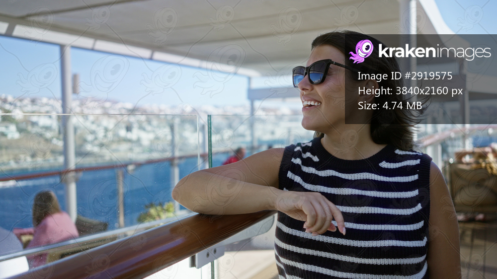 Young brunette woman lifts sunglasses and smiles, arm resting on wooden deck railing, hair blown by breeze, on ship building terrace with ocean view; serenity. - Kraken Images