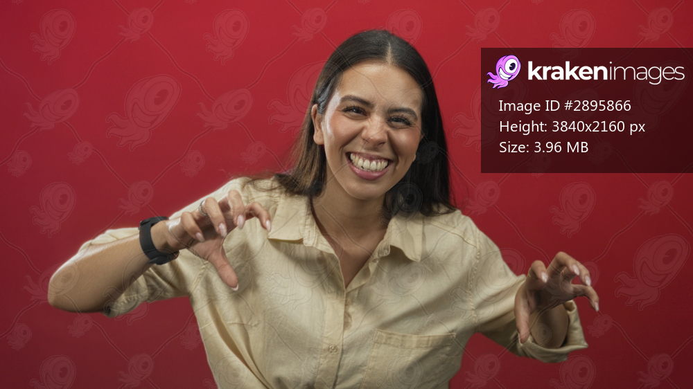 Young brunette woman making claw hands and laughing with teeth visible in red studio; playful confidence.