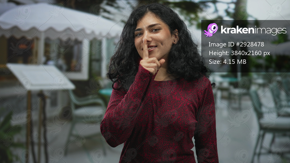Young brunette woman with nose piercing finger to lips for silence at a street restaurant terrace outdoors; playful secrecy.