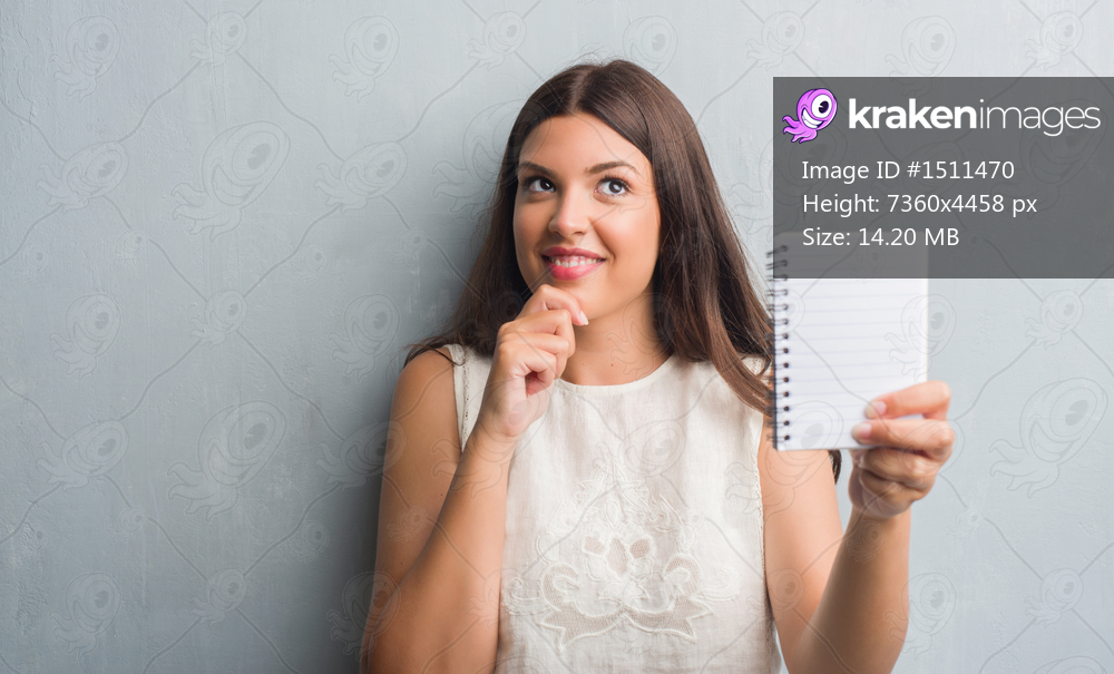 Young brunette woman over grunge grey wall showing notebook serious face thinking about question, very confused idea