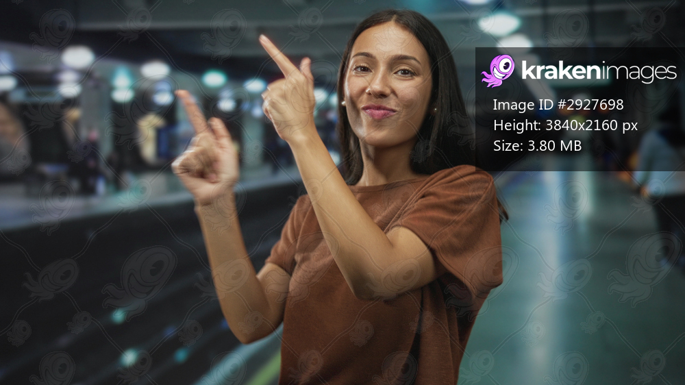 Young brunette woman points finger with both hands toward platform while standing on tiled station concourse wearing brown shirt; playful confidence.