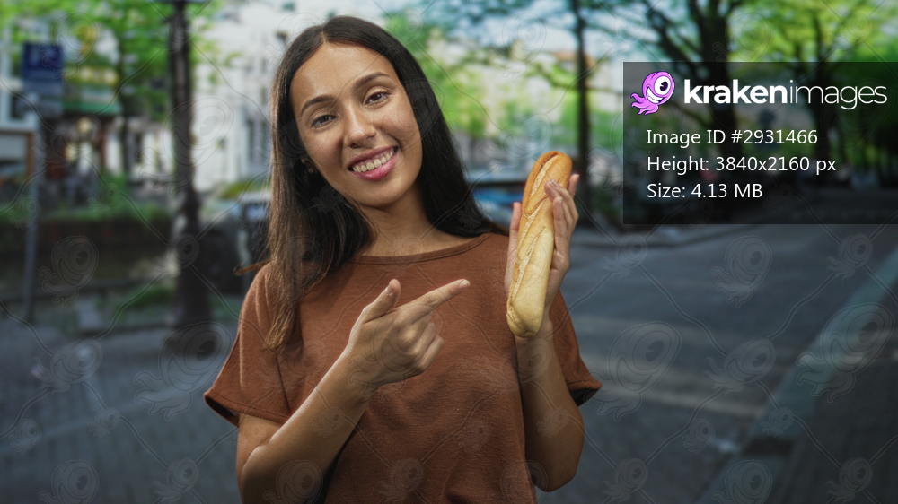 Young brunette woman points finger to baguette she holds on street by canal with parked cars and green trees; casual snack joy.