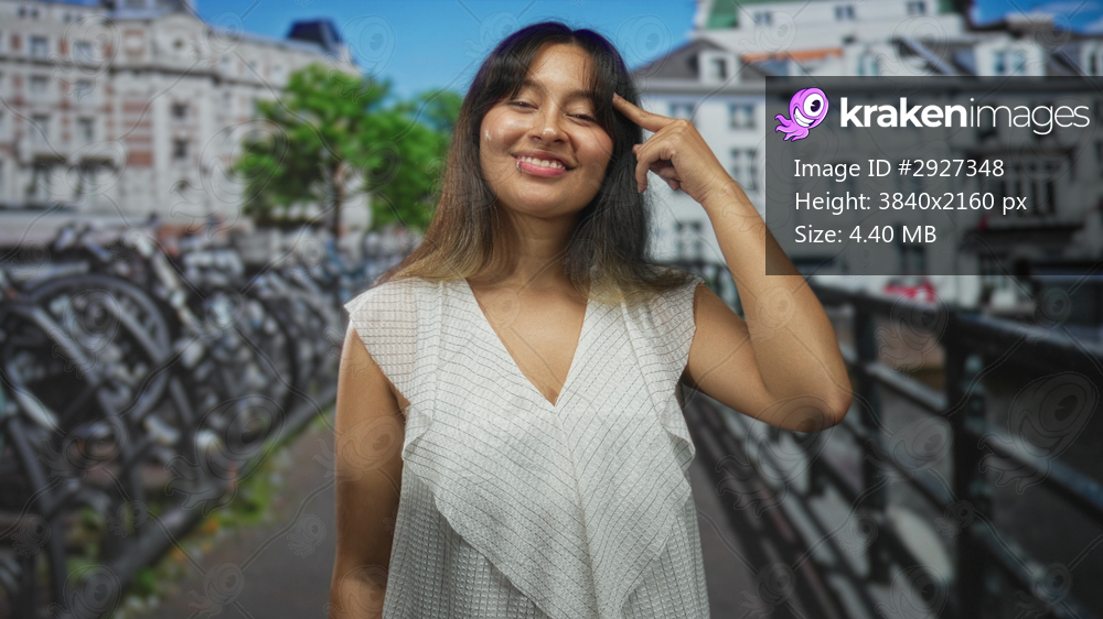 Young brunette woman points finger to head on street in amsterdam near canal and bike racks wearing white blouse; playful thinking.