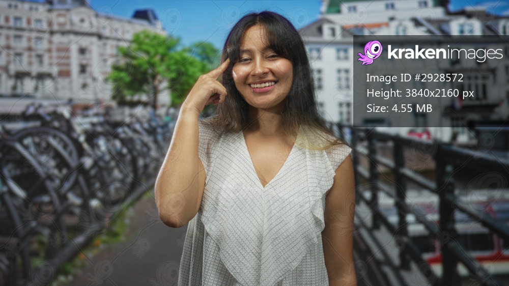 Young brunette woman points finger to head on street in amsterdam near canal and bike racks wearing white blouse; playful thinking.