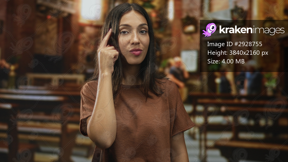 Young brunette woman points finger to temple while standing among wooden pews in a church, facing camera; contemplation faith.