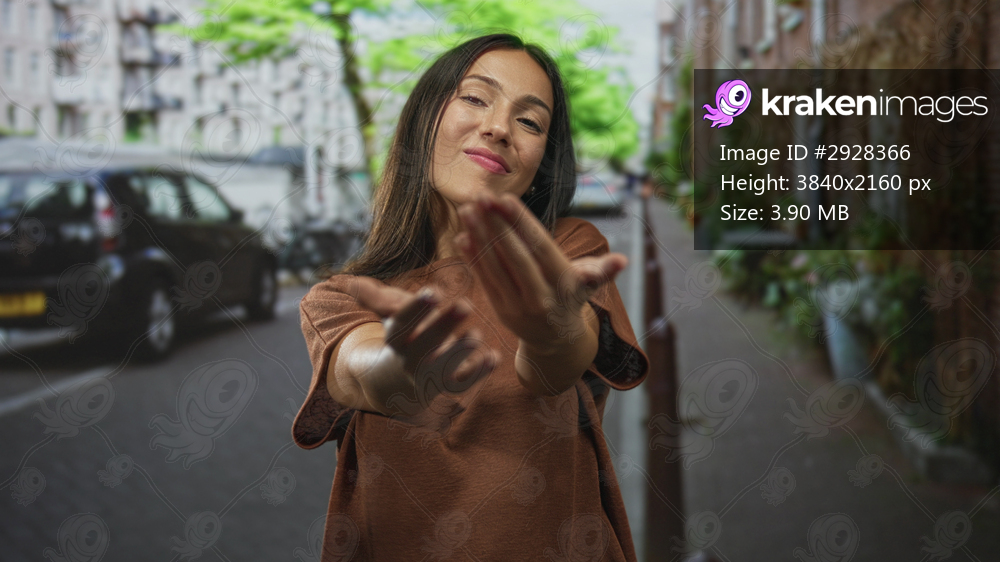 Young brunette woman reaches out with open hands on a city street, palms visible and inviting; affection connection.