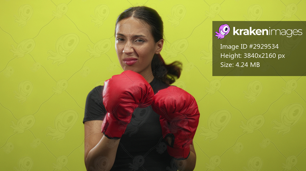 Young brunette woman with red boxing gloves holds fists up in studio with lime green wall; determination grit.