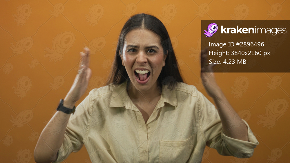 Young brunette woman shouting with hands raised and mouth open, wearing beige shirt and smartwatch in orange studio; frustration.