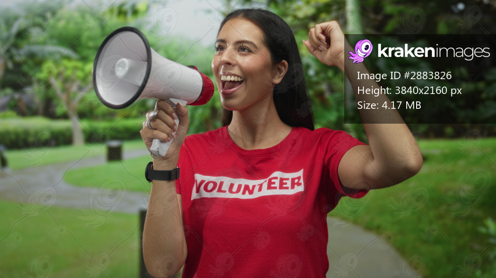 Young brunette woman shouting into megaphone in park wearing red volunteer shirt and raising fist; community outreach enthusiasm.