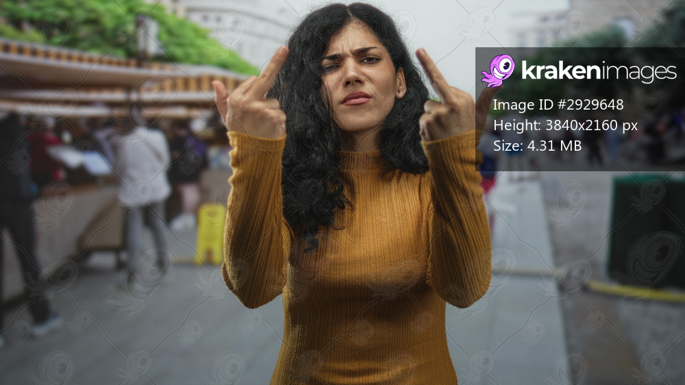 Young brunette woman showing middle fingers with bare hands amid busy street souvenir market stalls, direct stare; urban defiance.