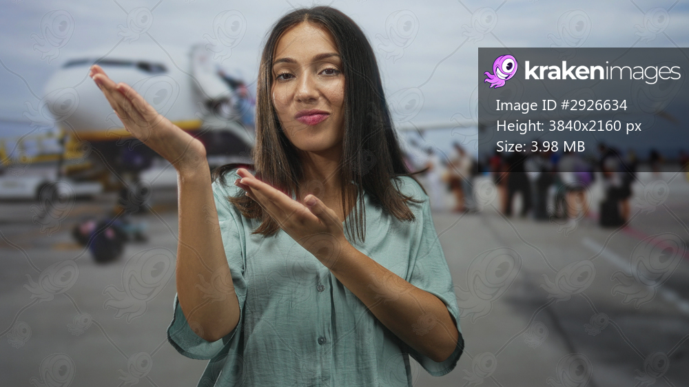 Young brunette woman showing palms up gesture on airport tarmac near airplane and passenger queue at terminal outdoors; travel patience.