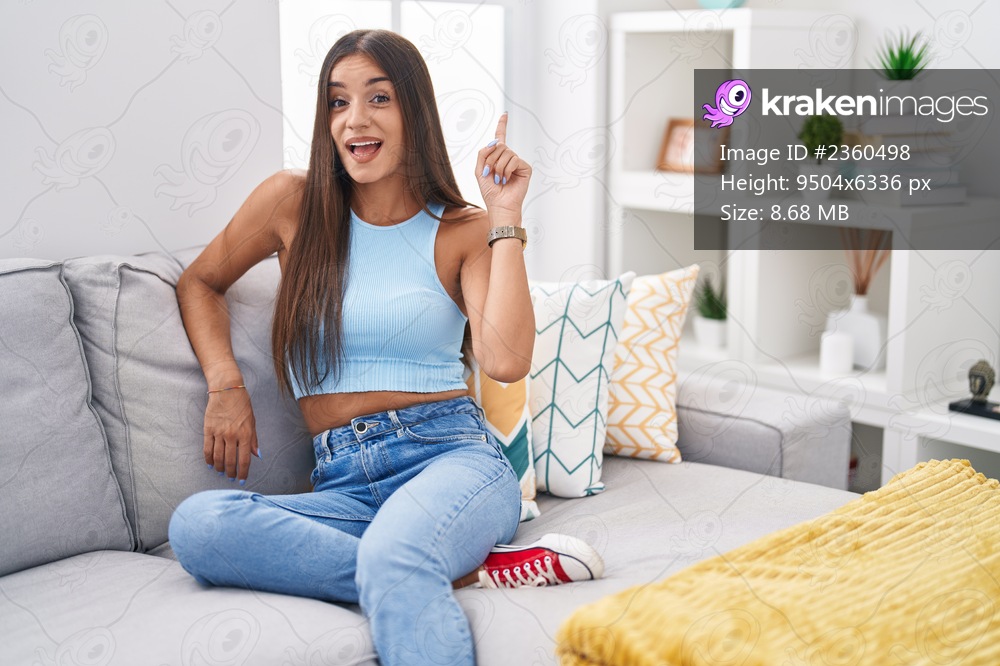 Young brunette woman sitting on the sofa at home pointing finger up with successful idea. exited and happy. number one.