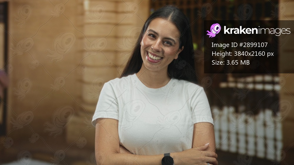 Young brunette woman smiling with arms crossed at building entrance, wearing white t shirt and smartwatch; confidence approachability.
