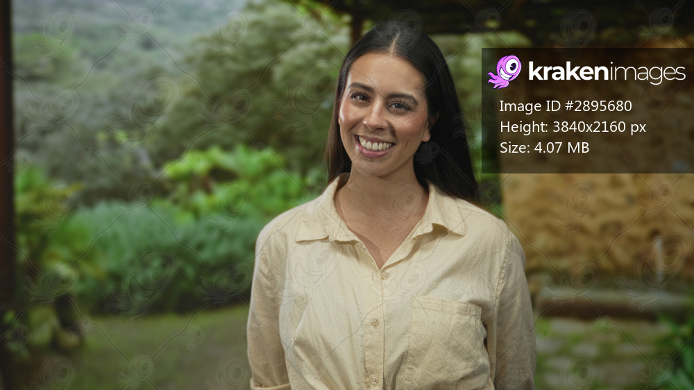 Young brunette woman smiling, face and neck visible, standing by a stone building in the countryside; serenity.