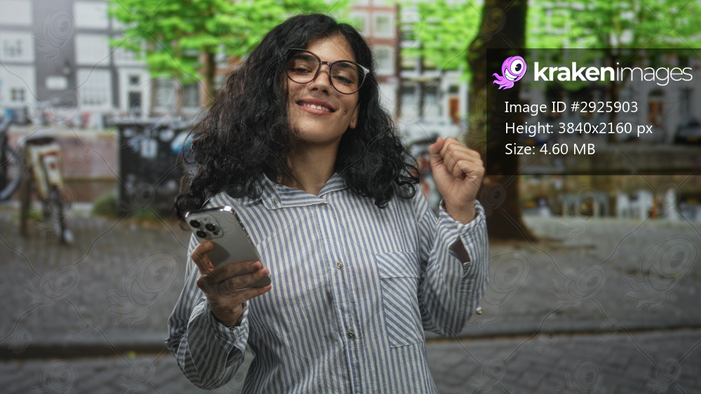 Young brunette woman smiling, holding smartphone and pumping fist on street; joy celebration success.