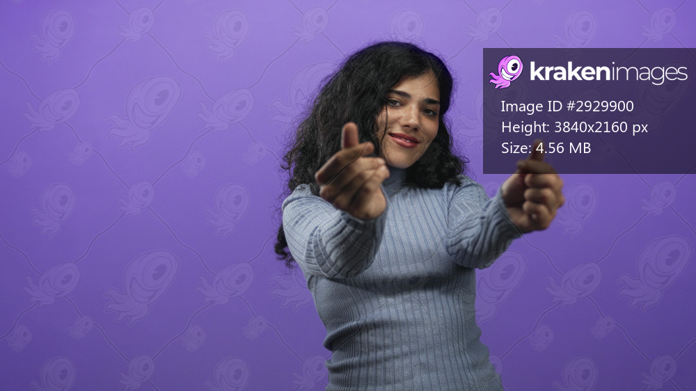 Young brunette woman smiling and making finger heart gesture with hands in studio purple set; playful affection.