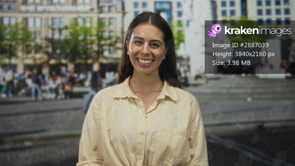 Young brunette woman smiling showing teeth with slight head tilt in beige shirt on busy street plaza with buildings and trees; joyful.