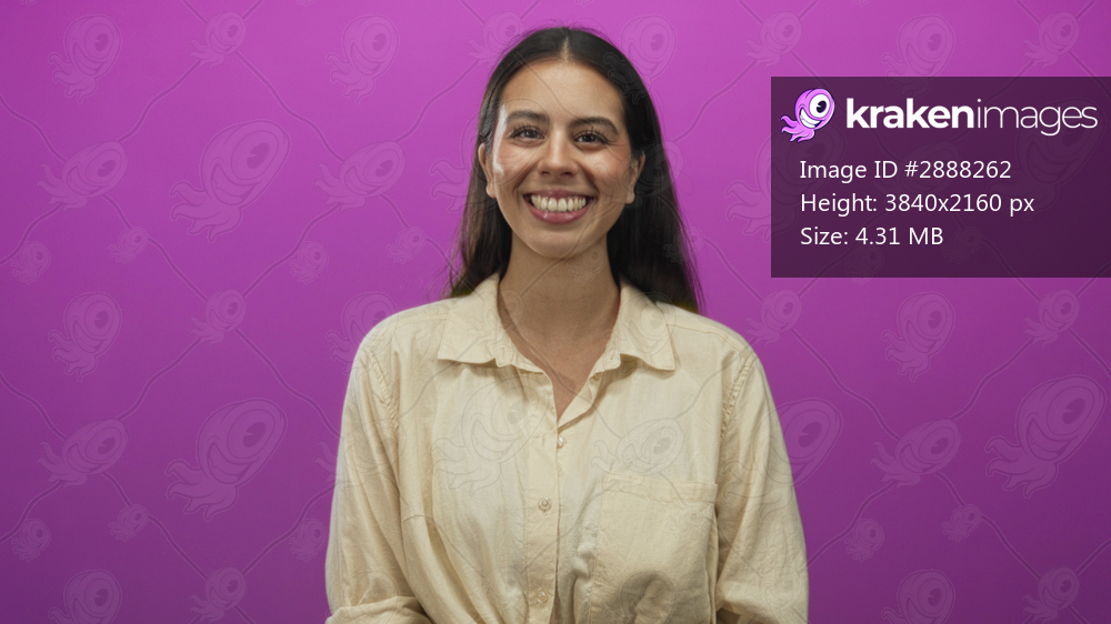 Young brunette woman smiling with visible face and teeth against a purple studio wall, wearing beige shirt and relaxed posture; joyful approachable.