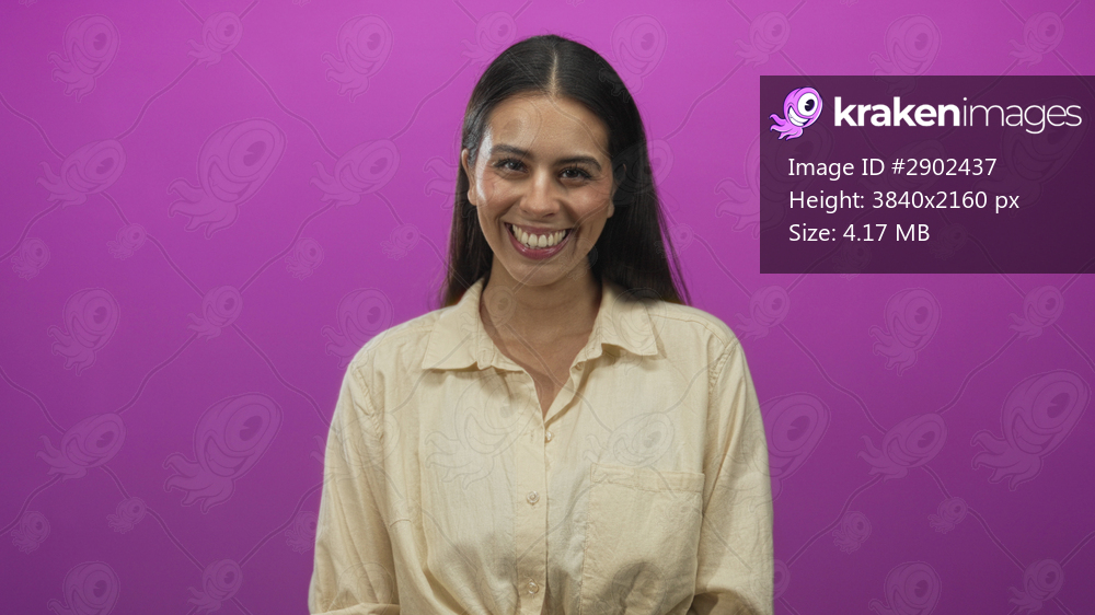 Young brunette woman smiling with visible face and teeth against a purple studio wall, wearing beige shirt and relaxed posture; joyful approachable.