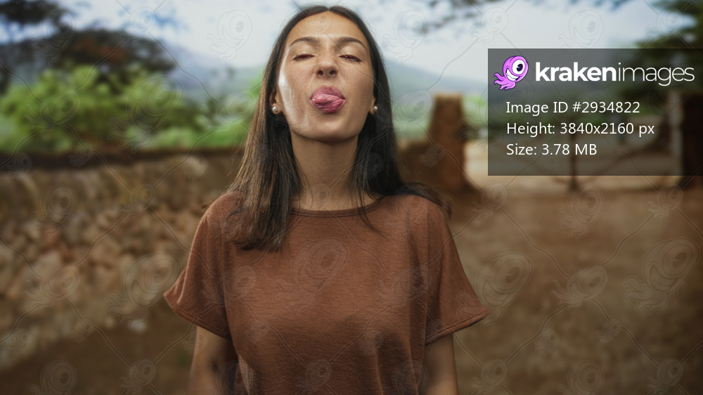 Young brunette woman sticks tongue out to camera in forest near stone wall and gate, wearing brown tee and pearl earrings; playful defiance.