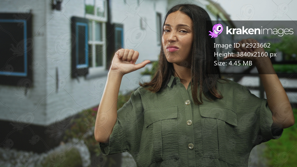 Young brunette woman with thumbs pointing to herself at building entrance, squinting and pursed lips in dismissive pose; indifference.