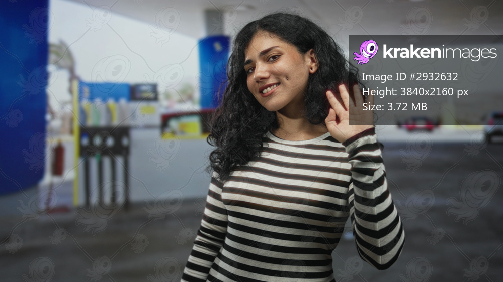 Young brunette woman waving hand by petrol pump on street, smiling with curly hair and visible hand raised in greeting; friendly greeting.