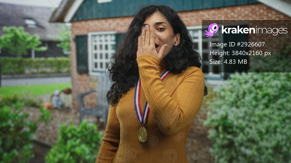Young brunette woman wearing a gold medal, hand covering mouth, standing at building entrance by window and shrubbery; surprised pride.