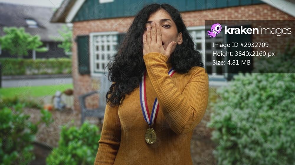 Young brunette woman wearing a gold medal, hand covering mouth, standing at building entrance by window and shrubbery; surprised pride.