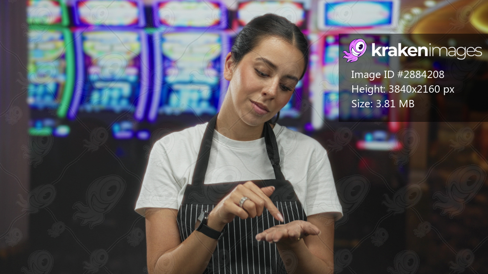 Young brunette woman wearing apron points finger to palm beside slot machines in building; professional concentration.