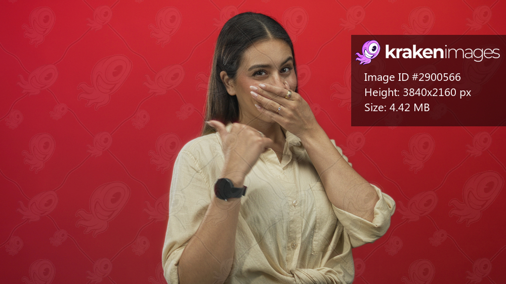 Young brunette woman wearing beige shirt covers mouth with hand and points thumb in red studio; surprise playful.