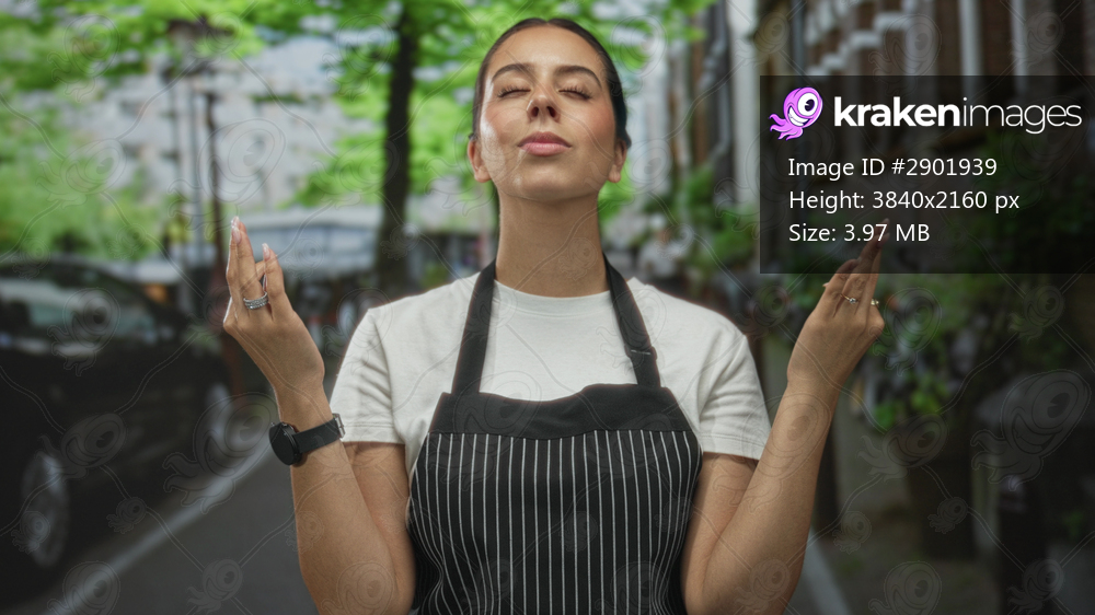 Young brunette woman wearing black pinstripe apron, hands raised with fingertips together and eyes closed while standing on a street lined with parked cars; calm mindfulness pause. - Kraken Images